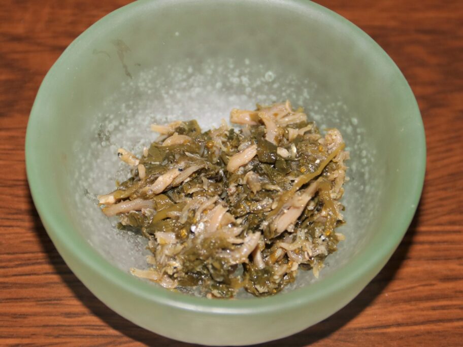 カウンターで券を渡すと、すぐに主菜、ご飯、味噌汁をお盆に置いてくれます。小鉢は自分で取ります。この日は切り干し大根でした。