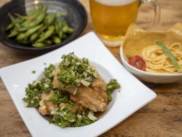 サラダはカニカマボコ入り。キュウリの酢の物の小鉢にはミョウガも添えられ、夏の名残りを感じます。
