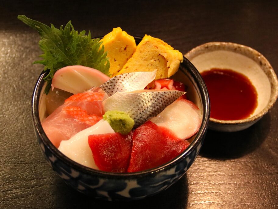 海鮮丼は小ぶりながらネタがぎっしり入っています。マグロが2切れにキンメ、タコ、コハダに玉子も2切れずつ。イカと真鯛、カマボコもありました。