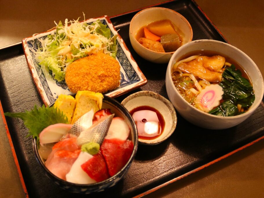 この日の日替わりは「海鮮丼とコロッケ」。即決です。好きな物の強力タッグ。大当たりですね。