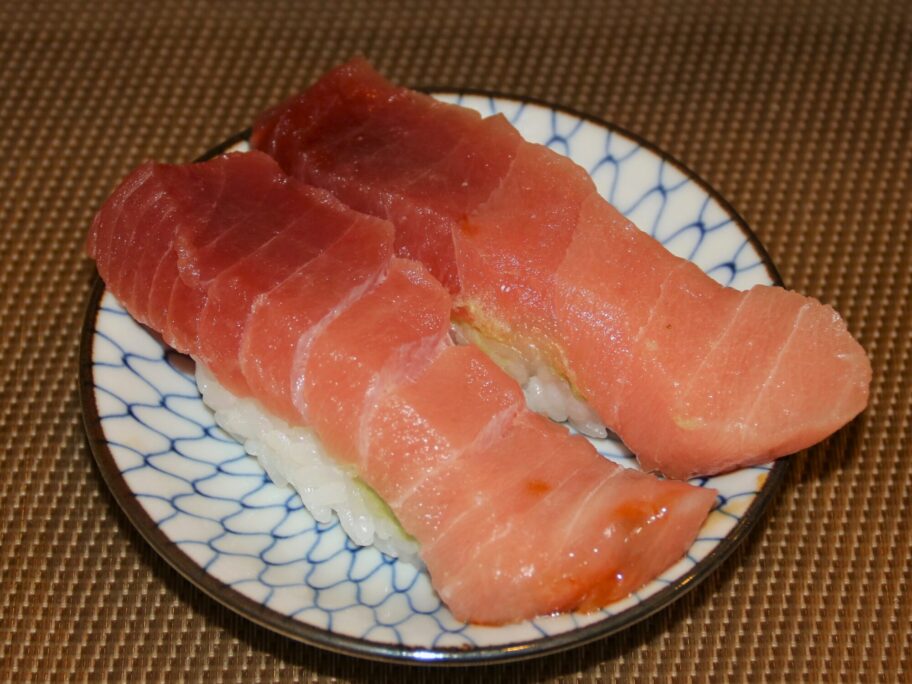丼にはぎっしりネタが詰まっています。マグロは3切れ。まずは、鮮やかなピンク色をしたのをいただきます。さっぱりした味わいですね。赤色が濃いめの2切れは漬けにしておきます。