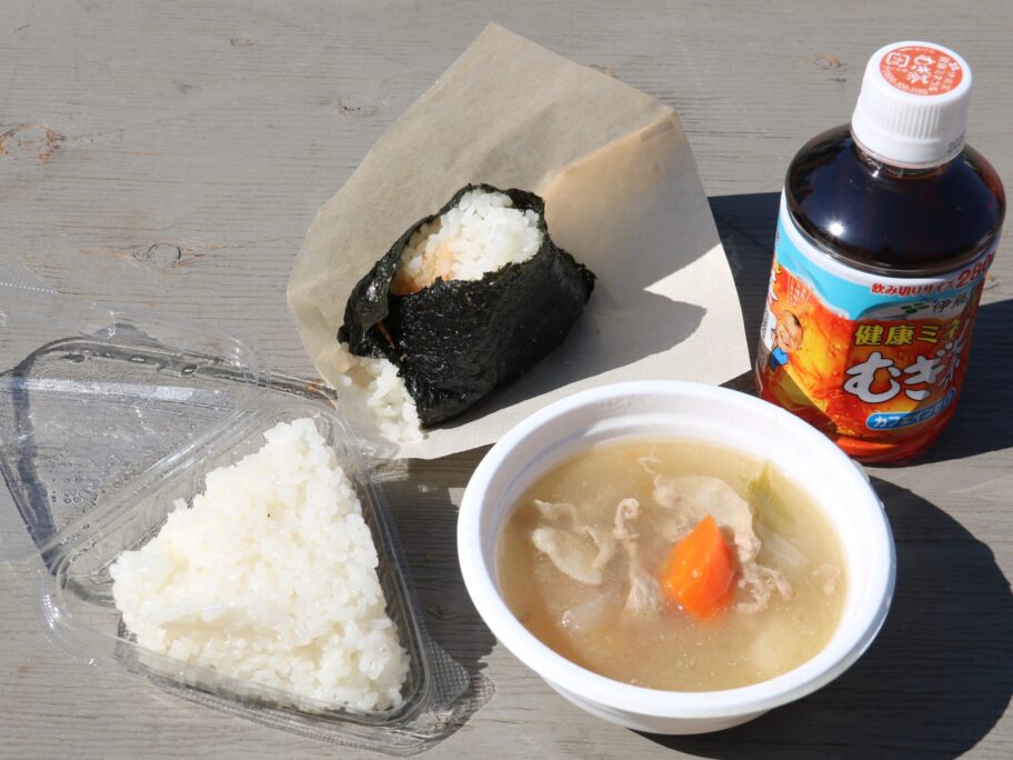 1番のお薦めの「塩」と1番人気の「明太子」に日替わりの汁、豚汁も付けました。持ち帰りもできますが、せっかくの炊きたて、むすびたて。天気もいいので、近くの中央イベント広場でいただきます。