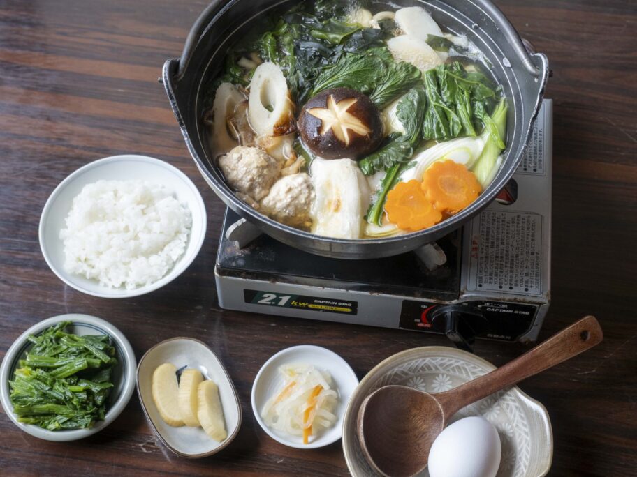 鉄鍋はグツグツ音を立て、いい香りを漂わせます。鶏つくね、シイタケ、焼き餅に自家農園で栽培した野菜もたっぷり。素朴でありながら、贅沢を感じます。