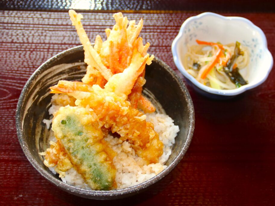 天丼もミニとは名ばかり。エビが2本にピーマン、ニンジンが盛られています。殊に千切りしたのをまとめて揚げたニンジンは歯応えよく、甘くて美味しかったな。タレは甘さ控えめですっきり。胃もたれすることなく完食できました。
