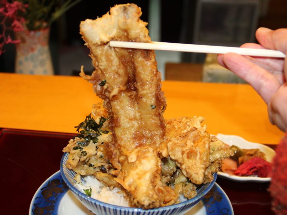 穴子は野菜天に隠されていました。引き出してみると、もうびっくり。長さは推定20㌢強。幅広で厚みも十分。箸で持つとずしり重さを感じます。