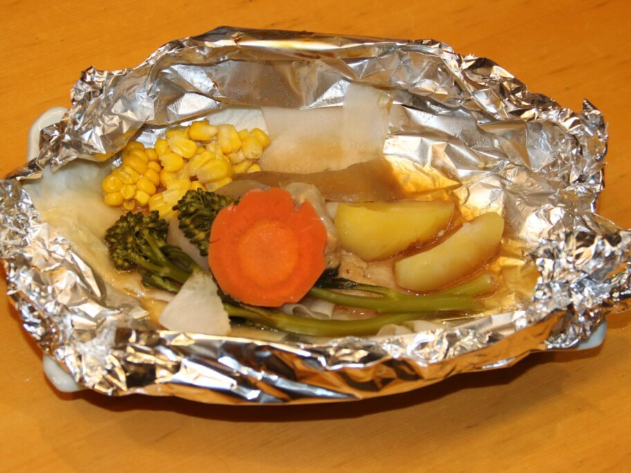 ▲春の野菜たっぷりの蒸し物。米豚はニンジンの下