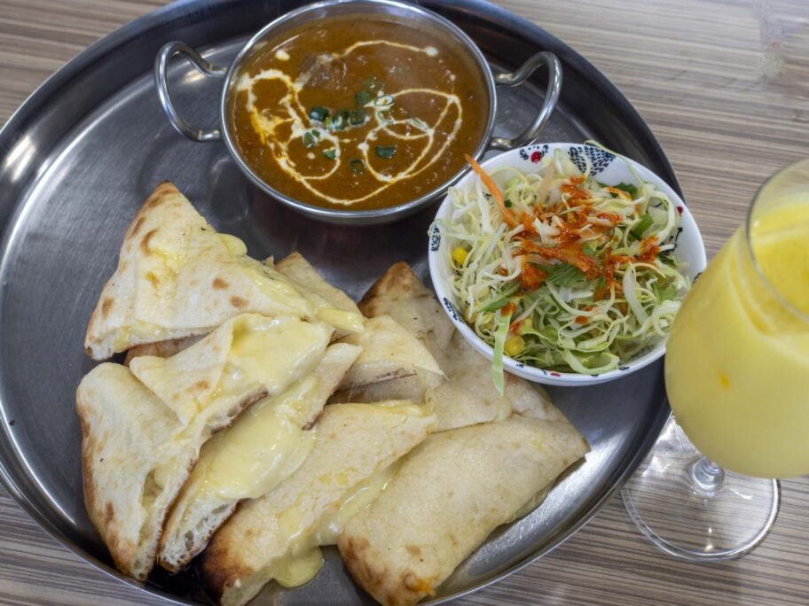 そして主役登場。キャベツ中心のサラダ、大盛りのマトンカレー、チーズたっぷりのチーズナン。シンプルだけど一つひとつが美味しそう。