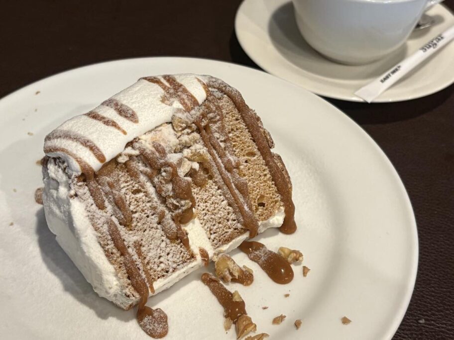デザートも充実しています。この日は「米粉シフォンケーキ キャラメルナッツ」をいただきました。ふんわり柔らかなシフォンに生クリーム、キャラメルの味が濃いソース、サクサクのナッツが乗っています。