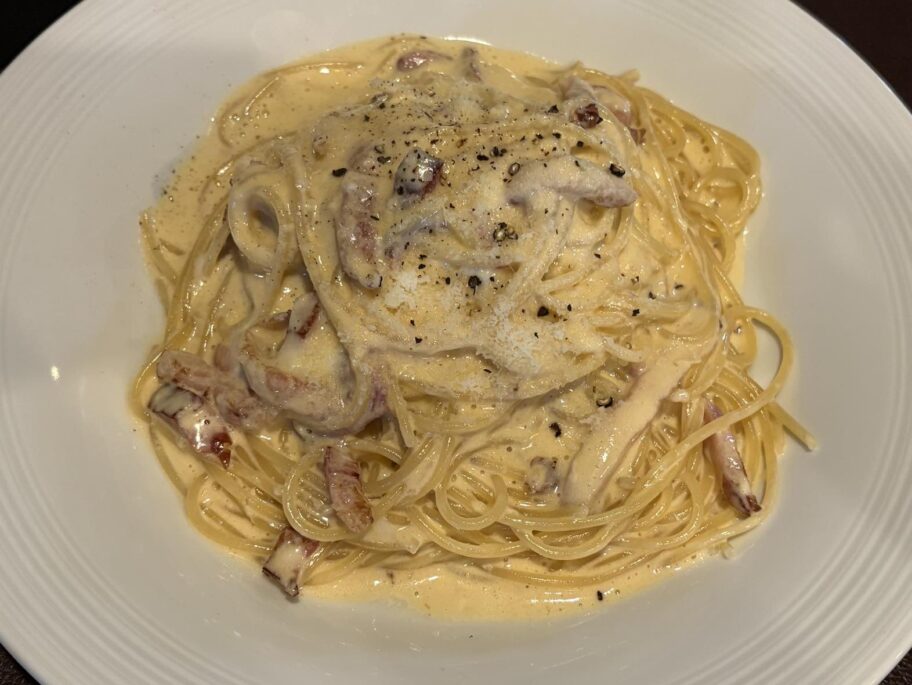 連れが頼んだのは、イカスミとは対照的な「カルボナーラ」。