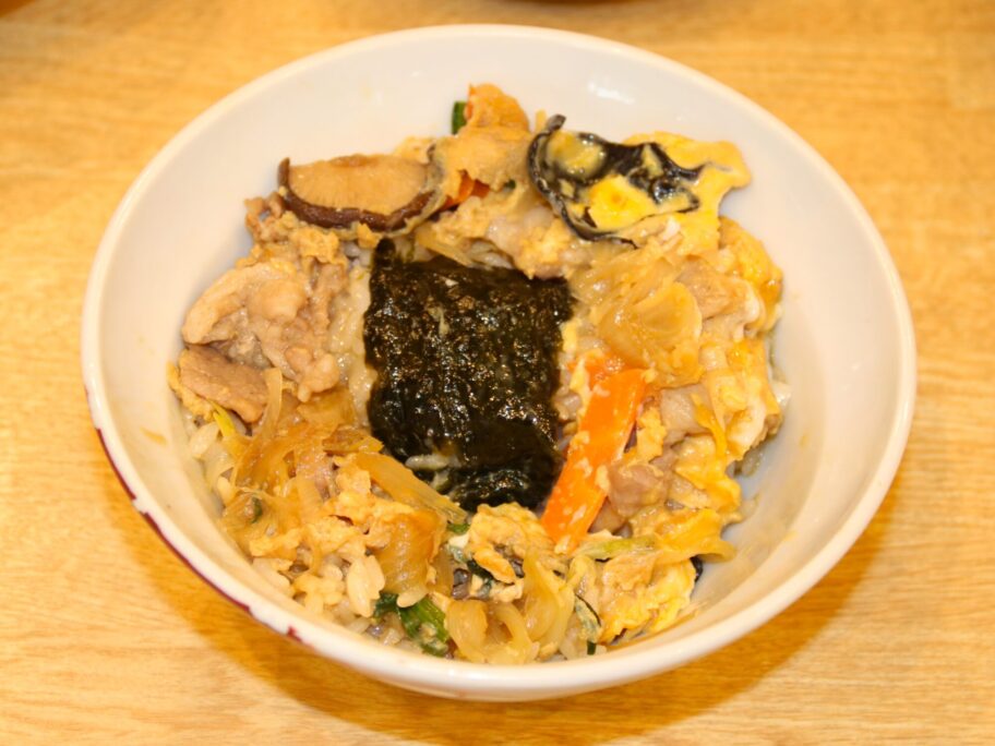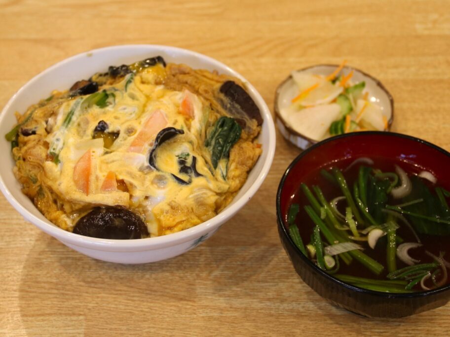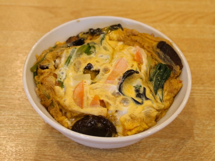 ほどなく配膳されたのは親子丼のよう。でも、具がいっぱい。タケノコにキクラゲ、シイタケ、ニンジン、ホウレンソウ。ネギとタマネギもあります。