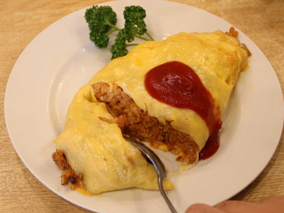 相方はオムライス。薄焼きの卵に包まれ、ケチャップがかかったオーソドックスなタイプです。それにしてもでかい。