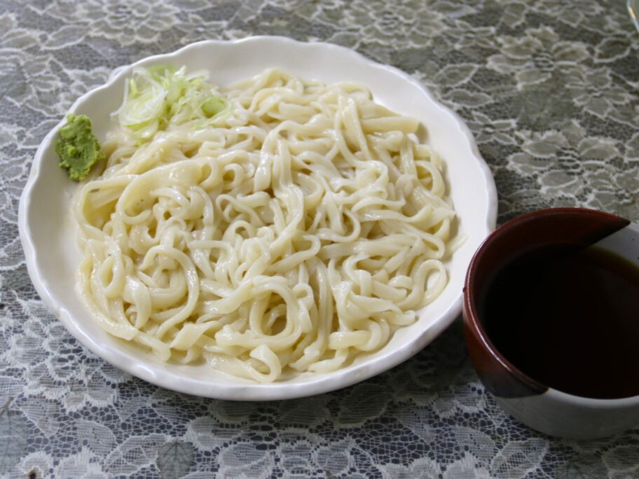 さっそく、うどんを啜ります。まずは、ワサビを麺に乗せて刺身のようにして。一瞬ツーンとしますが、すっきりしたうどんを楽しめます。