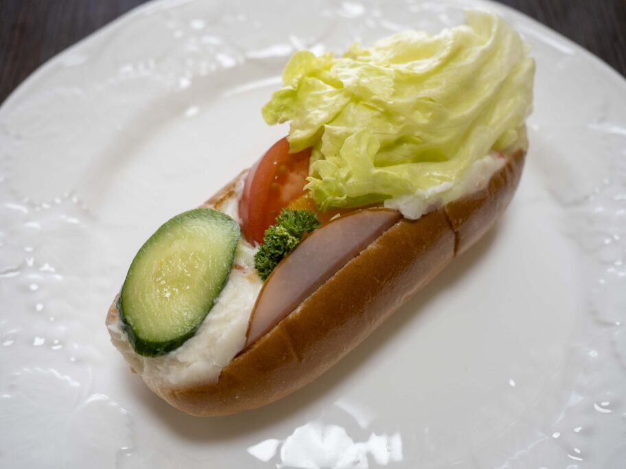 サークルのポテトサラダはとびきりの美味しさなんですが、大ぶりのロールパンの中にびっしり詰め込まれています。上にはたっぷりのレタスとハム、トマト、缶詰ミカン。