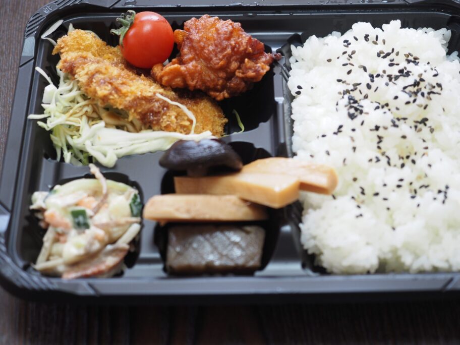 さて、この日の弁当は…。主菜は鶏の唐揚げとヒレカツ。副菜はタケノコ、シイタケ、コンニャクの煮物とメンマでした。マカロニとゴボウのサラダも入っています。ご飯も結構な量がありますよ。