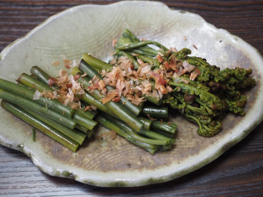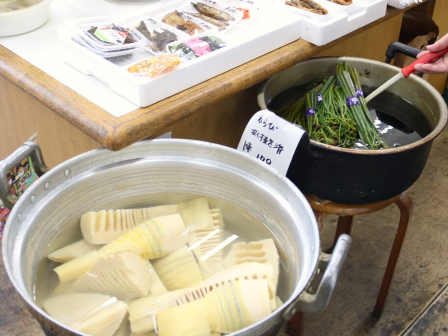 野菜が山積みされている店先でフキを見つけました。春ですね。うれしくなって店に入ると、灰汁抜きしたタケノコとワラビがありました。タケノコの穂先は刺身でいただけそう。