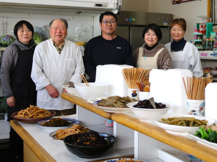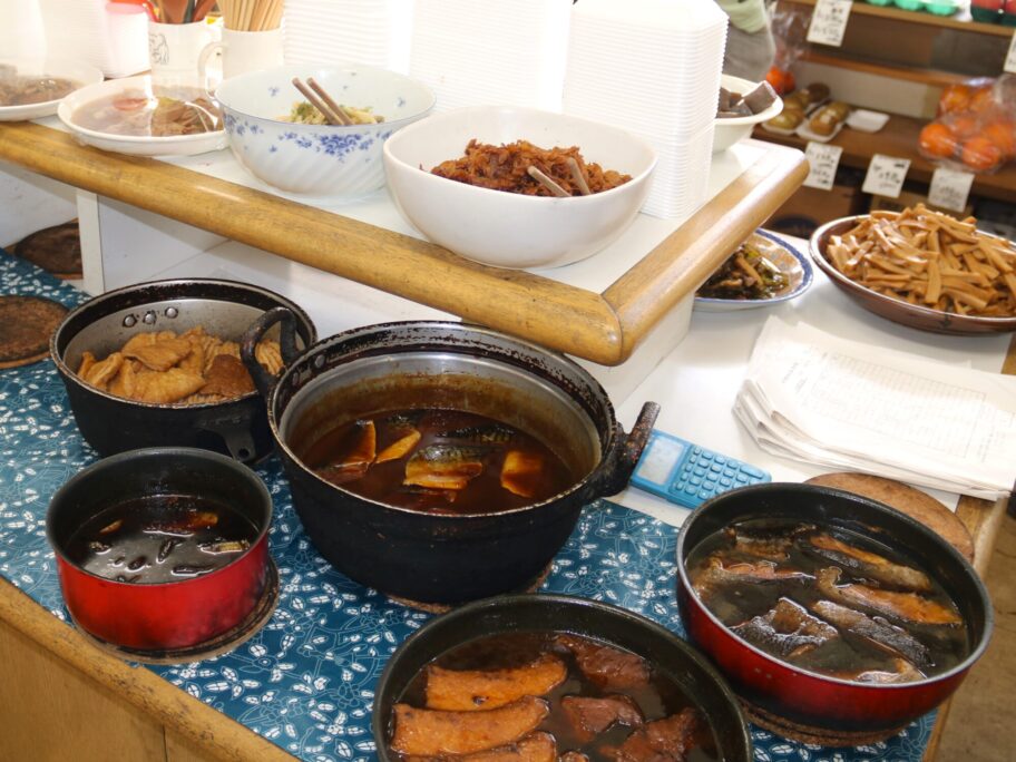 野菜の煮物やサラダ、サバの味噌煮、天ぷら…。40種類ほどの惣菜がテーブルに並んでいます。どれも手作り。あれもこれもほしくなります。