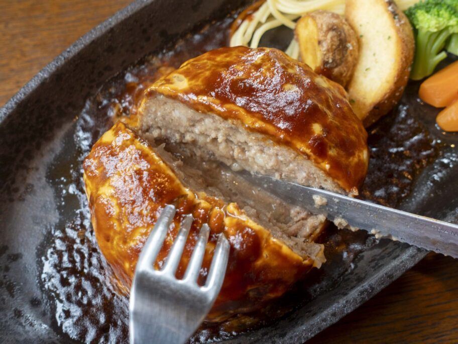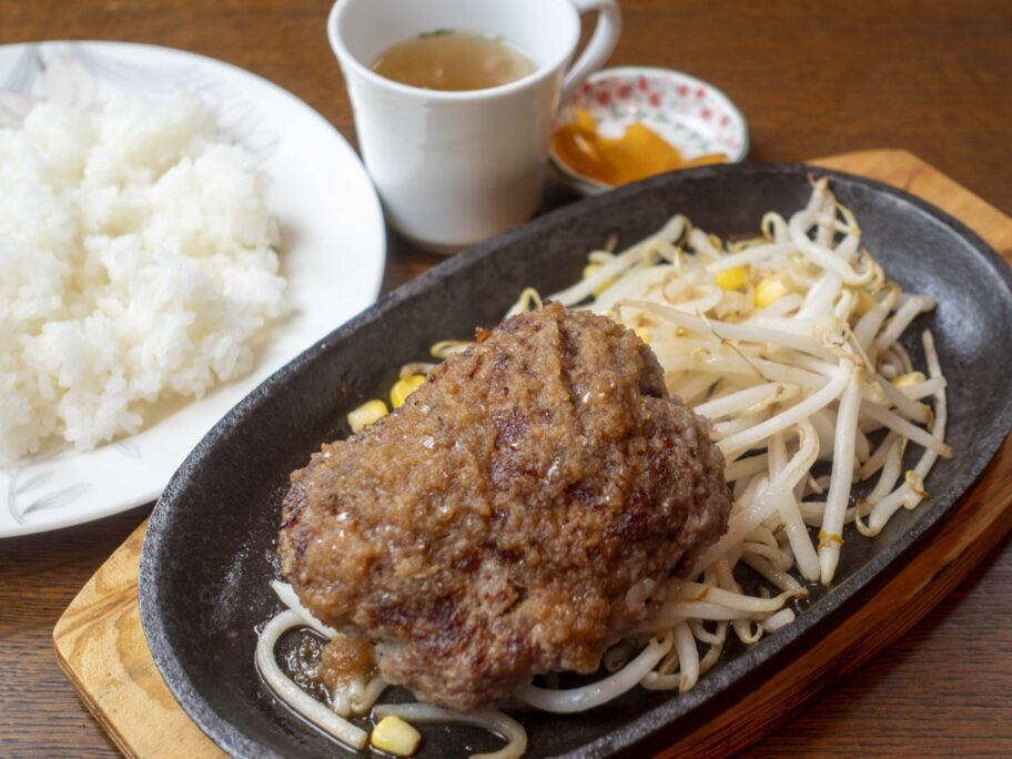 1番人気は「粗挽きペッパービーフ定食」。牛肉の塊が熱々の鉄板に乗って登場します。一見、ハンバーグのようですが牛肉100%。ナイフを入れると、肉汁がジュワーと流れ出てきます。
