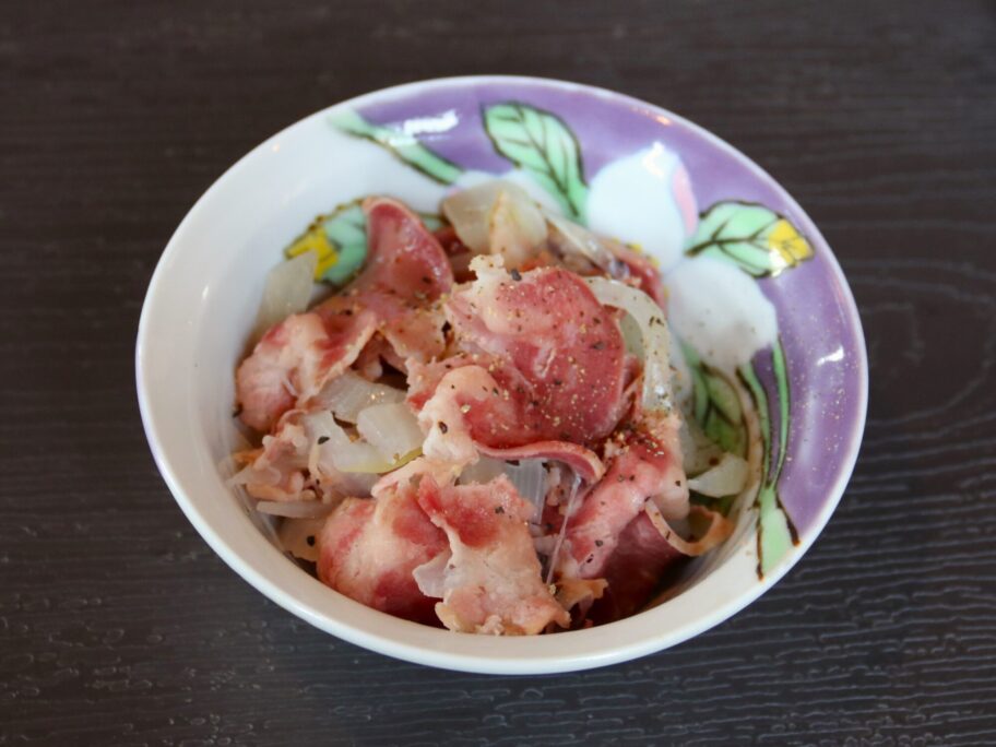 さて、謎のタン塩玉葱をいただきましょう。スライスした豚タン塩とタマネギの炒め物でした。黒コショウが効いています。いいですね、この組み合わせ。これもご飯が進みます。