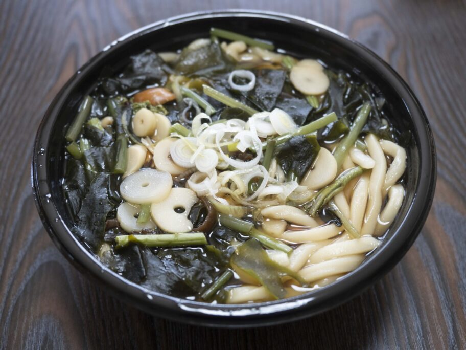 直径18㌢の丼の中にうどんと温かいつゆ、水煮の山菜、たっぷりのワカメ、ネギが入っています。注文してから作ってくれるのでアツアツを食べられるのはうれしい限り。