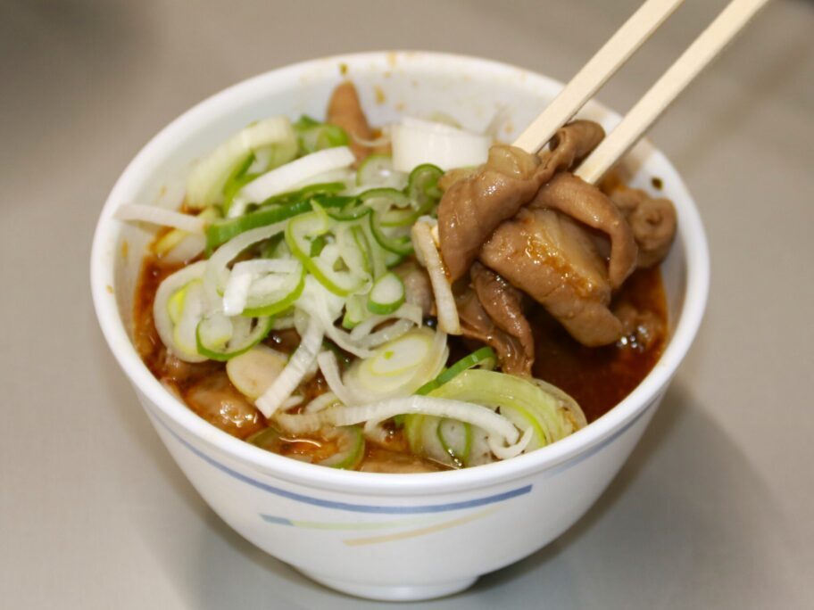 もつ煮はニンニク、ショウガが効き、ちょい辛。ご飯が進みます。酒にも合うでしょう。