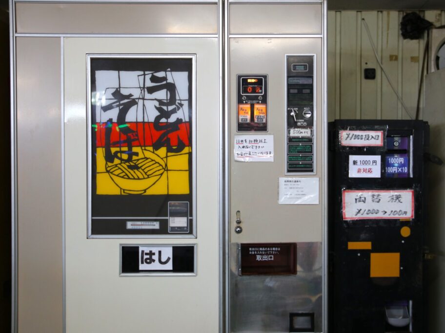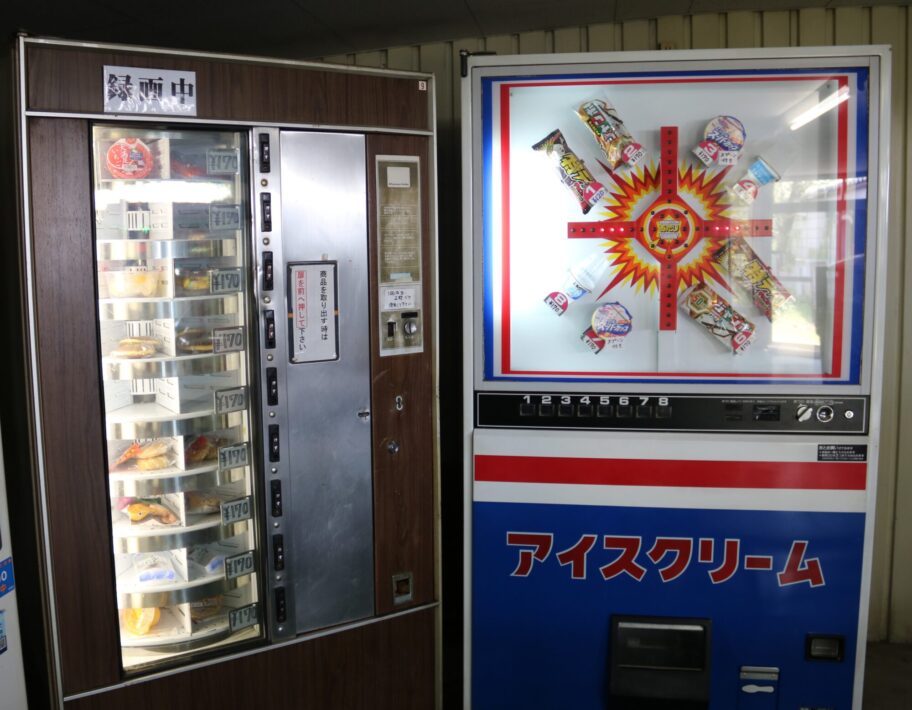 ▲自販機は硬貨のみ。両替機は新札対応できないのでご注意を