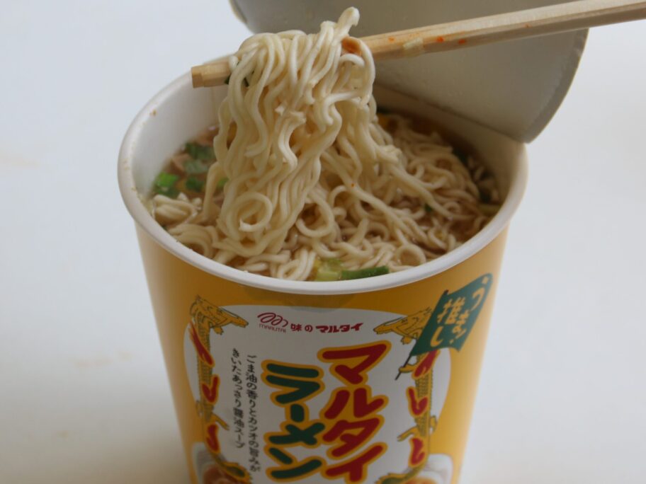 めん類自販機の隣にあるカップ麺の自販機でマルタイラーメンを発見しました。スープ付きの棒状麺はよく買いますが、カップ麺があったとは。