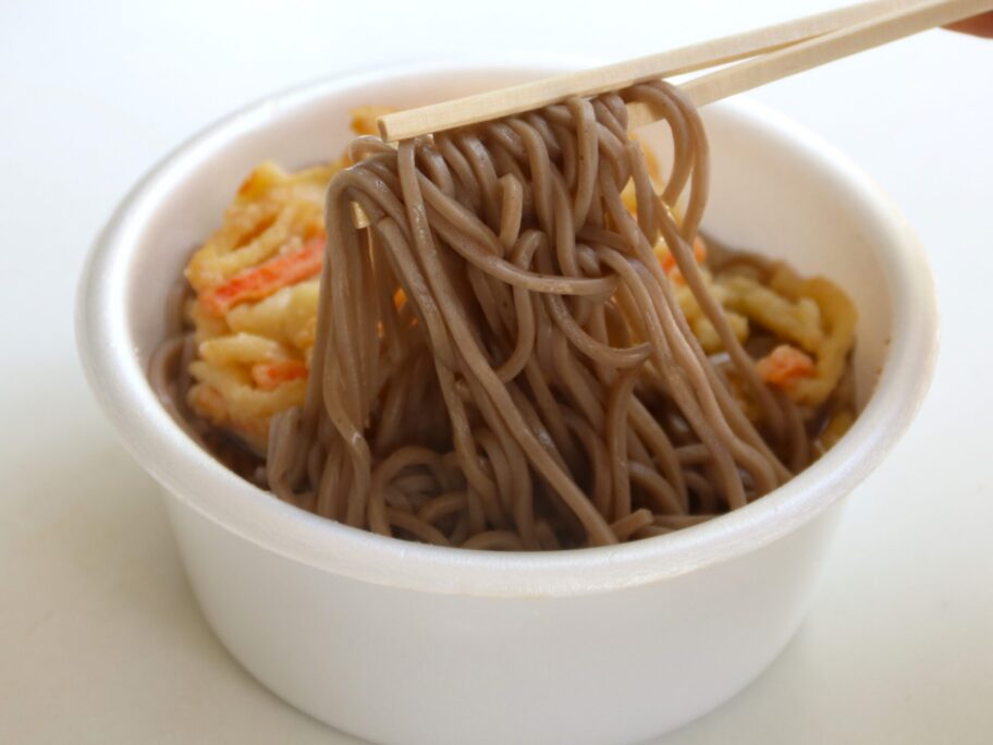 カップうどんと同じ丸い容器です。20円高い蕎麦から行きます。大きなかき揚げが入っていました。