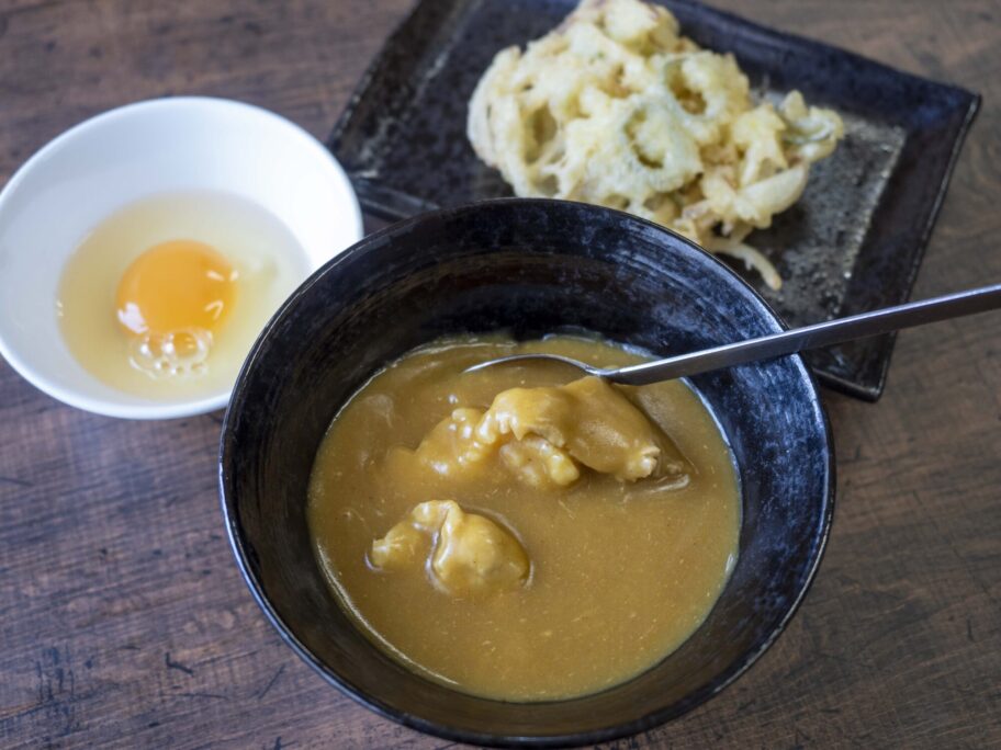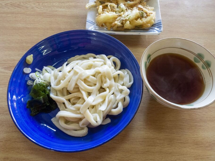 啜るのではなく、嚙みしめるうどんがこの汁によく合います。温かいのもいいですが、コシの強さを感じるのには冷たい方がいいでしょう。卓上にある一味をたっぷり掛ければ辛味噌になります。
