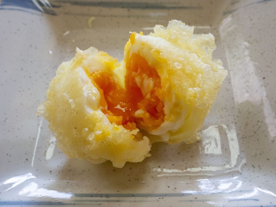▲半熟卵の天ぷら。黄身に醤油をかけて