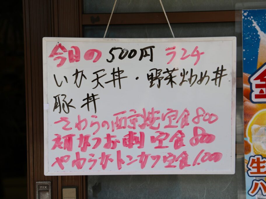 居酒屋さんのランチって「当たり」が多いですね。夜のPRのためか、美味しい定食を安く出してくれます。それにしても、すごい。日替わりのランチに2、3品、ワンコインメニューがあります。