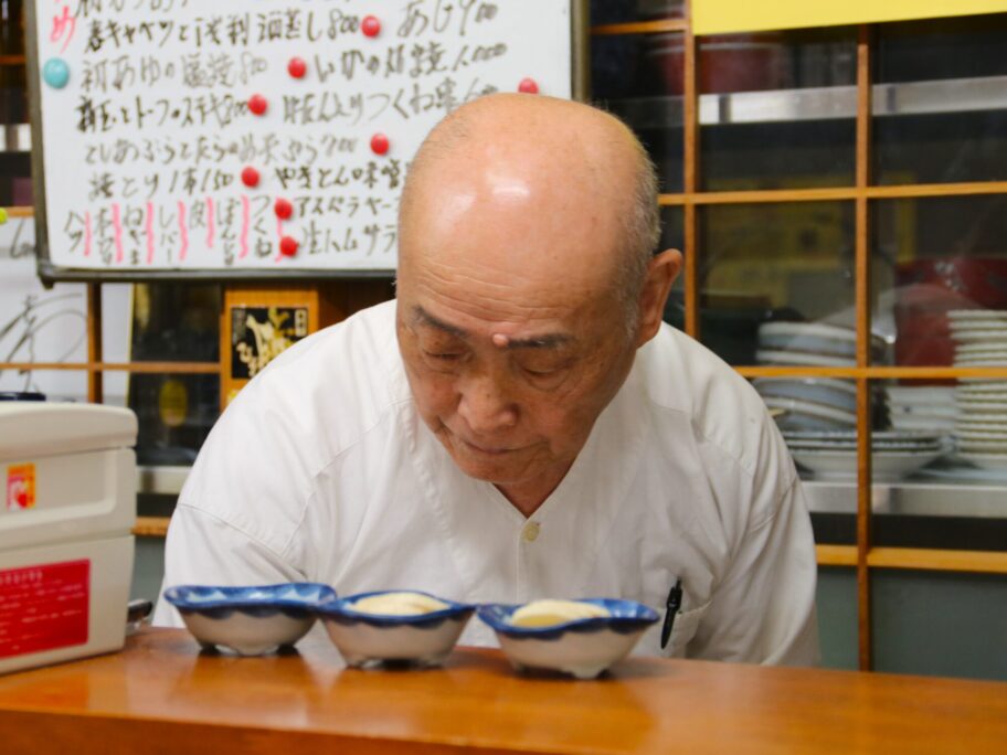 イカ天丼を頼みました。注文を受けると、和食一筋53年の店主、塩野和美さんがイカを切り分けるところから始めます。作り置きはしません。