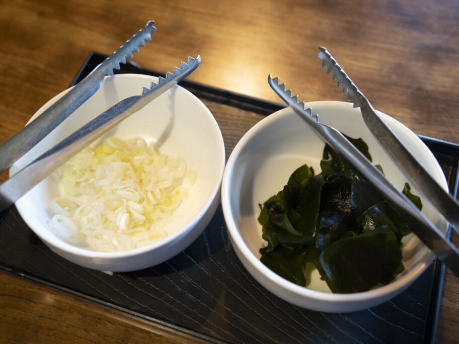 蕎麦をもりでいただきます。注文すると、すぐにワカメとネギが用意されます。