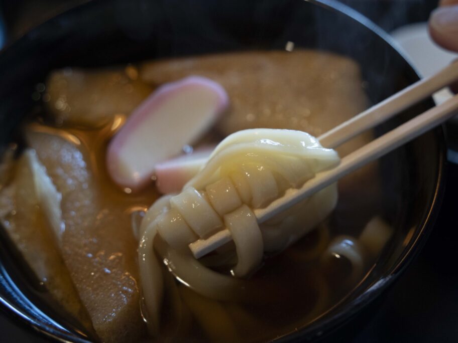 大きなお揚げが3枚。うどんが隠れて見えません。お揚げは出汁を吸って素晴らしくジューシー。出汁は濃口の関東風ですが、カエシが控えめで優しい味わいです。