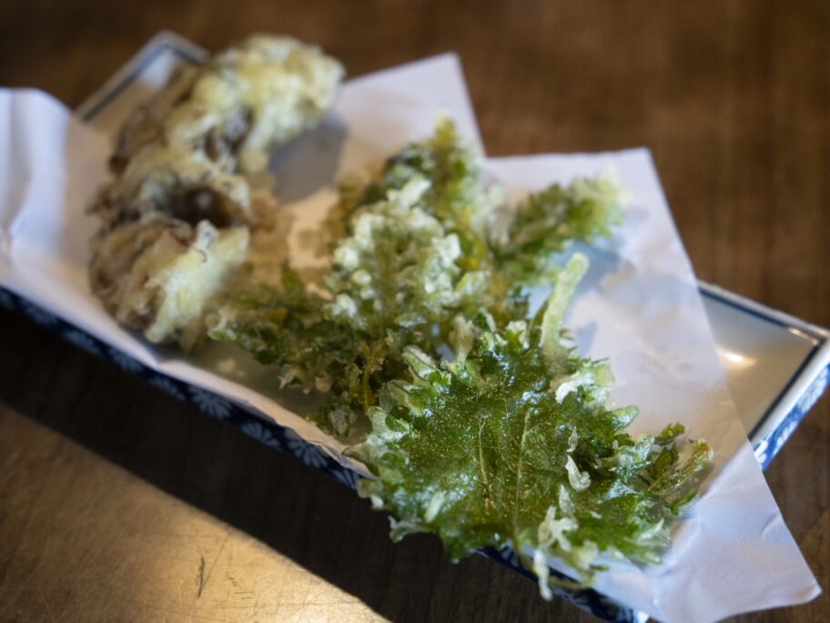 ワンコインオーバーですが、天ぷらをいただきました。常時、7、8種類あります。シュンギクと舞茸を注文したら、シソが1枚おまけに付いてきました。「余計に仕入れたからサービスよ」と店主の志田正子さん。こういうのがうれしいんです。