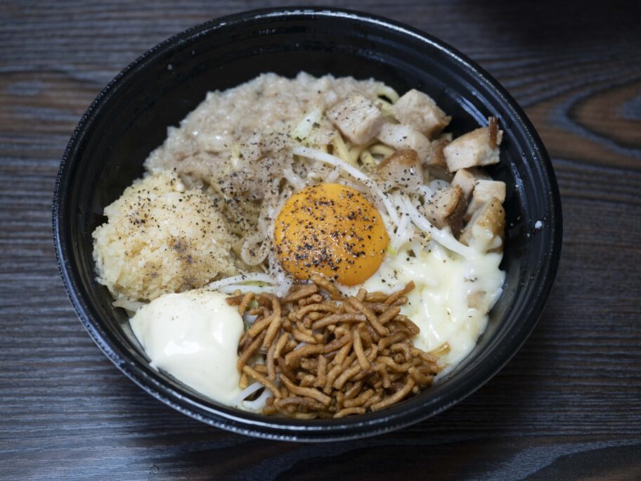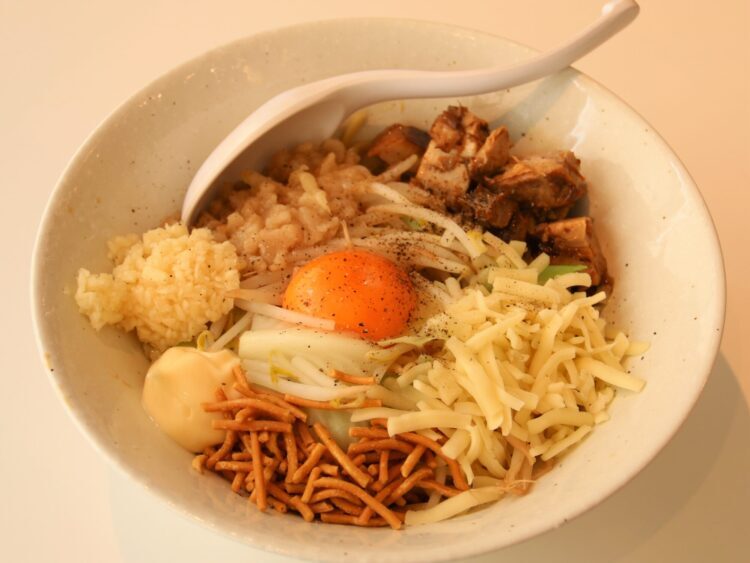 相変わらずジャンキーですね。小口切りにしたチャーシューがゴロゴロ。揚げ麺はベビースターを彷彿させます。チーズ、マヨネーズ、背脂、ニンニクもたっぷり。中央には卵黄が鎮座します。