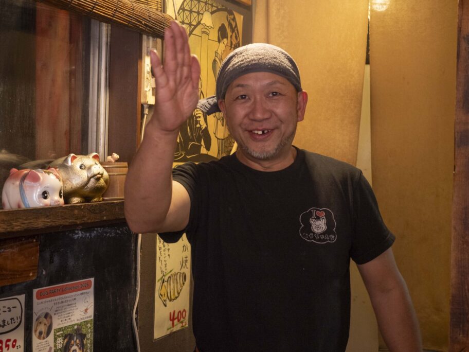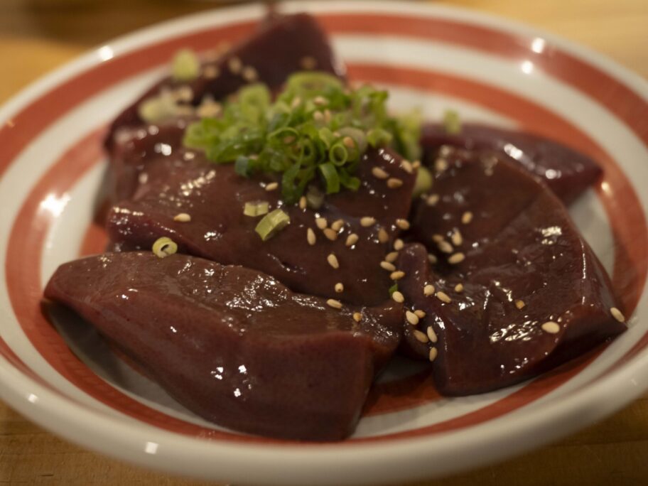まずは上レバーから。「超新鮮なものが入ったときしか出さない」と威勢と愛想のいい店主、小野晃人さん。さっと焼いて、ゴマ油と塩でいただきます。