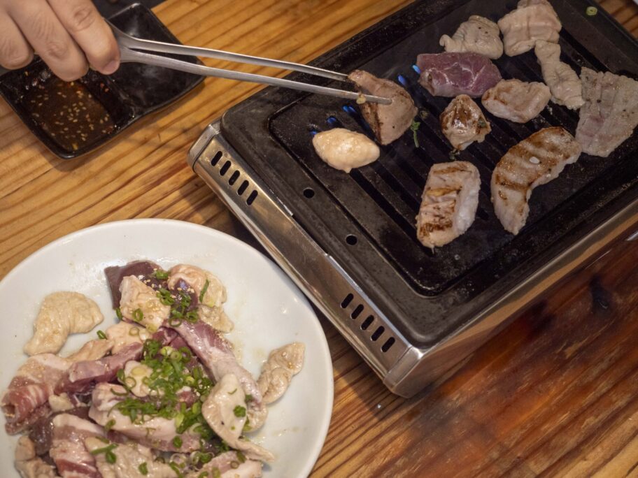 さあ、じゃんじゃん焼きましょう。大きなシロコロは脂がとろけます。レモンもいいけど、梅がよく合います。一押しの豚ハラミは弾力があります。辛ニラを載せて。豚タンはやっぱりネギ塩ですね。
