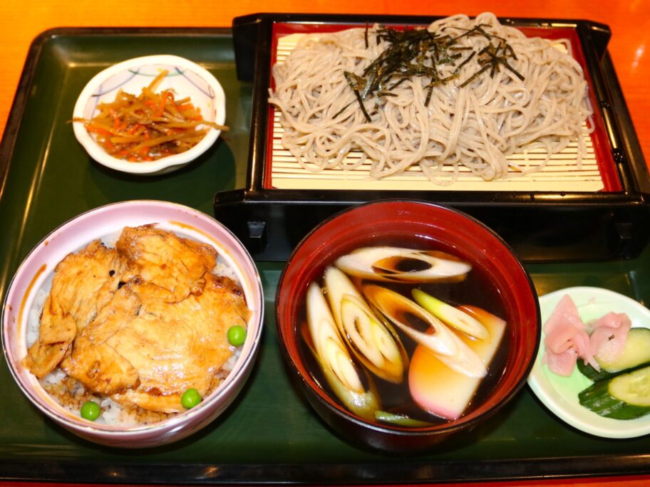 でも、この日の注文は蕎麦、「かしわつけめん」です。蕎麦も評判がよく、1度食べてみたかったので。冷たい蕎麦を熱々の汁でいただく、鴨汁の鶏肉版です。うれしいことに、ミニの鳥めしかソースかつが付いてきます。
