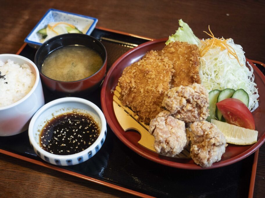 ▲から揚げとチキンカツが味わえる鳥合わせ定食