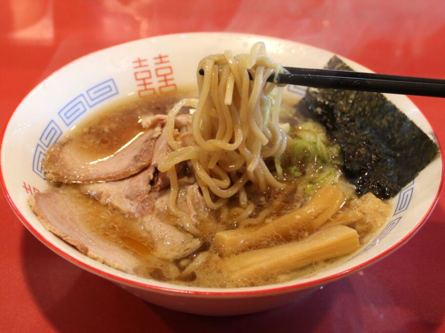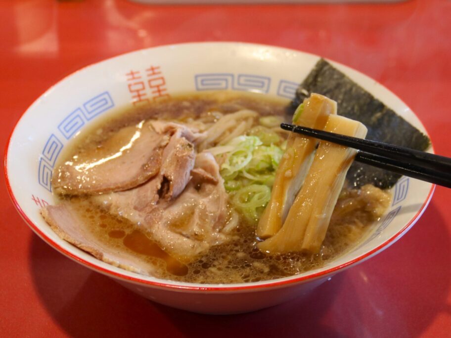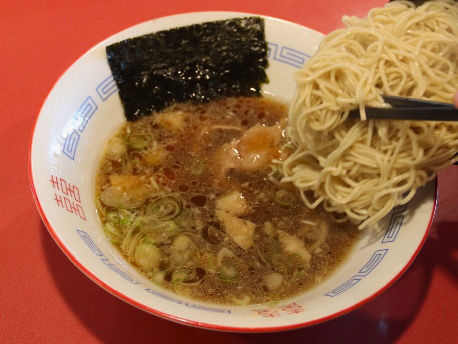 まずはスープを一口。「群馬県民向け」に濃いめ。生醤油を使った強めのカエシを地鶏のスープがまろやかに、背脂が甘くしてくれます。