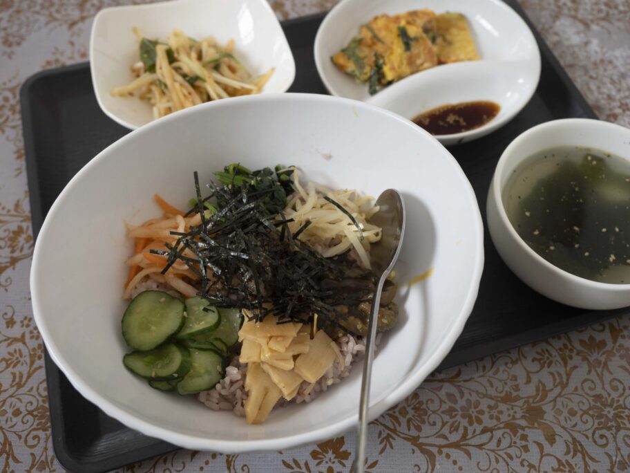 ちょっとずつ味見させてもらいます。ピビンバは五穀米ご飯の上にキュウリ、豆もやし、ほうれん草、豚挽肉、タケノコが乗っています。繊細に細かく切ってありますね。ざくっとかき混ぜてひと口。ほんのり胡麻油の香りがして芳ばしい。