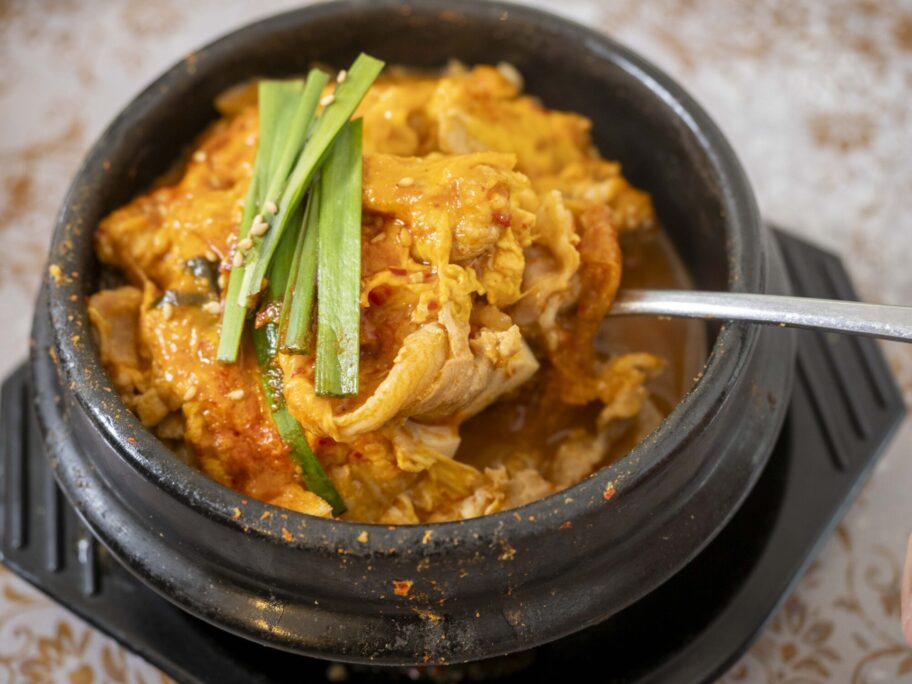 チゲはキムチ、豚肉、タマゴ、シメジ、豆腐、ニラが入って具だくさん。スープをひと口飲みます。あ、思ったほど辛くない。程よい辛さで美味しい。