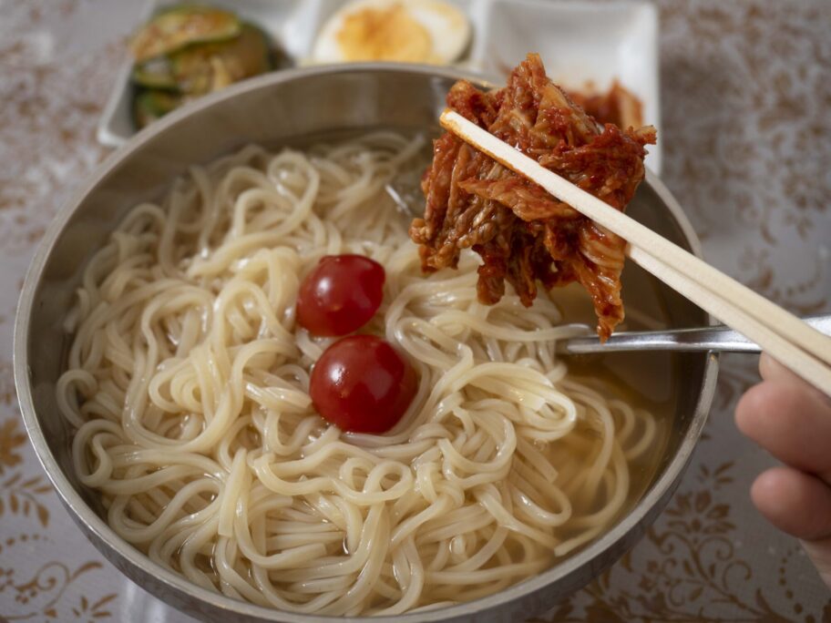 冷麺は珍しい太目の丸麺です。手作りのキムチをたっぷり入れていただきます。