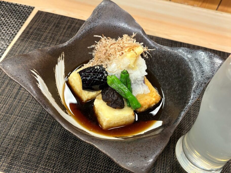 では、腰を据えてホッピーに。アテは揚げ出し豆腐。これも想像以上の大きさです。ナスやシシトウが添えられ彩り鮮やか。いい出汁、出ていました。
