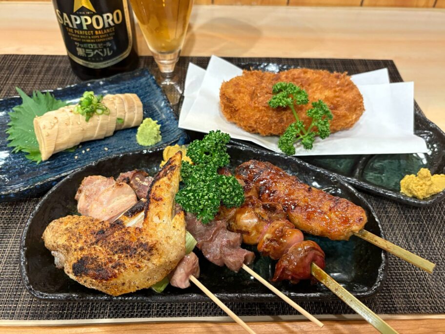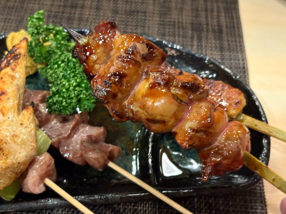 お薦めの串焼きは盛り合わせ5本を。こんがりと焼き目の付いた手羽先、ねぎま、砂肝は塩。砂肝のコリコリ感がいいですね。