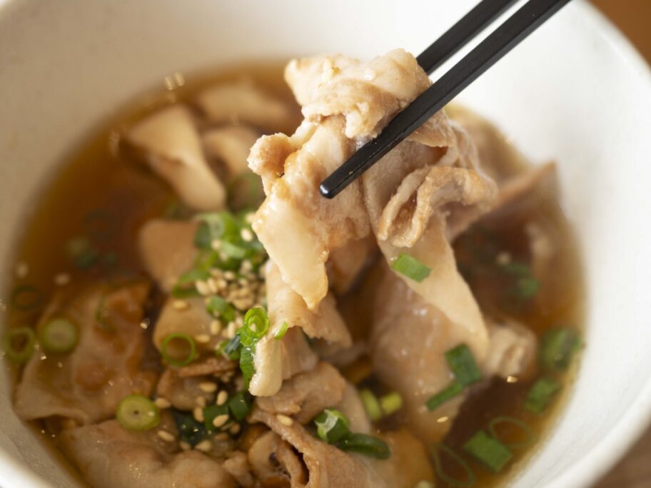 ▲豚バラ入りの熱い汁で冷たいうどんをいただく