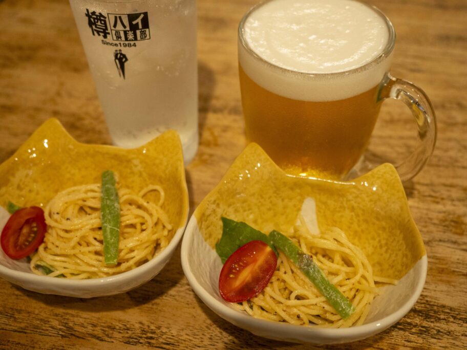 夕暮れ時に伺い、まずはビールから。連れはレモンサワーで。お通しは明太子味のスパゲティサラダ。ネコの形の器に入っています。さすが、どやねこさん。