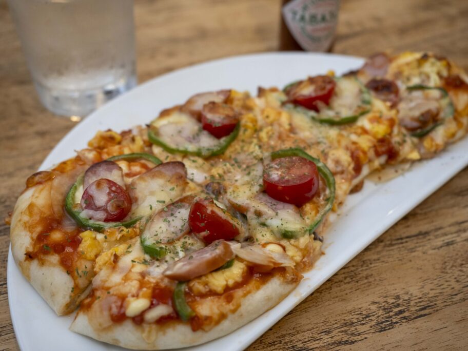 ふっくらしたナンに、ウィンナー、トマト、炒り卵、ピーマン、玉ネギが乗ったピザの登場です。卵がほんのり甘い。