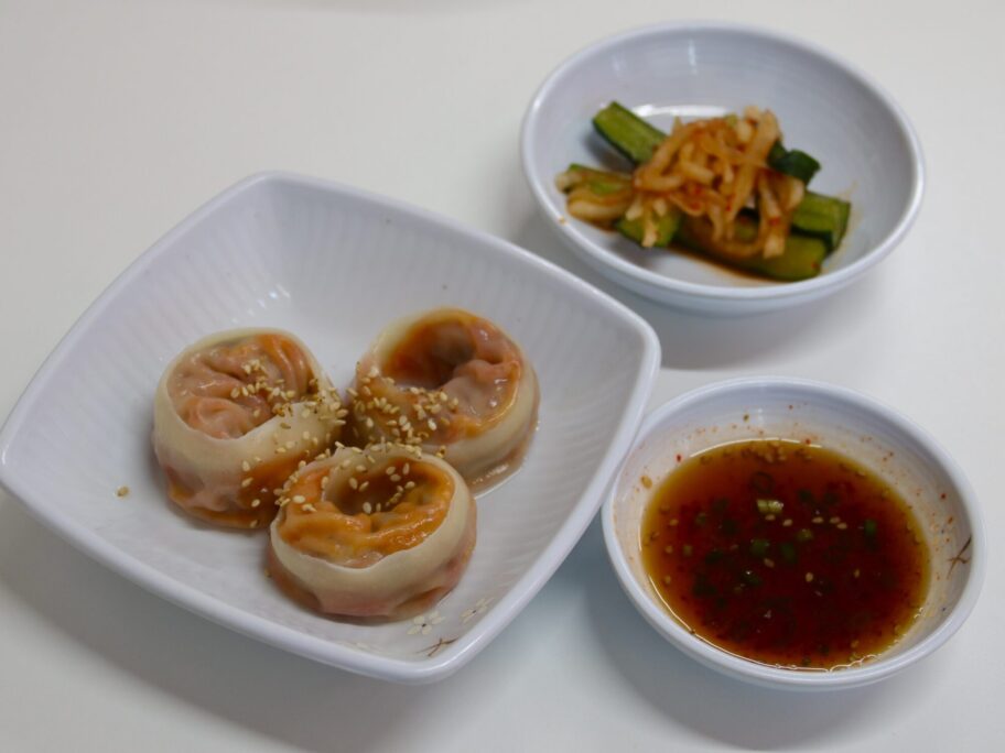 ラーメンだけでは寂しいので、韓国の餃子、マンドゥを付けました。「豚肉や野菜を混ぜた餡を皮で包んで茹でます。美味しいですよ」と店のオモニ。ハーフサイズがあり、キムチマンドゥにしました。