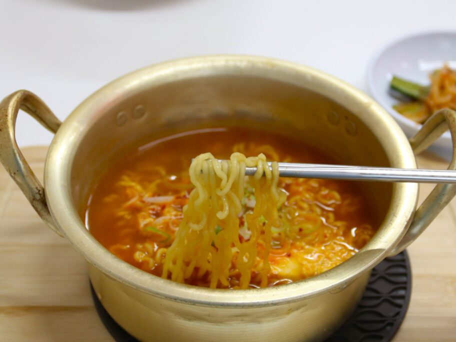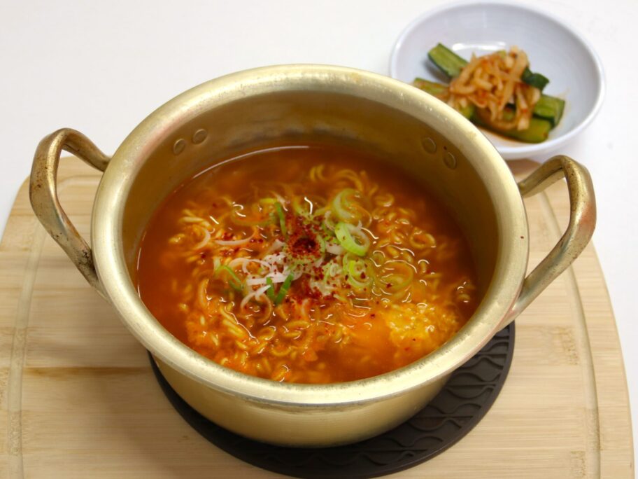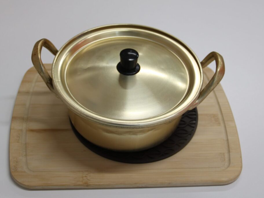 韓国ドラマで見るアルミ製の鍋がやって来ました。熱々です。蓋に麺を乗せて食べるのが流行っているとか。普通にいただきましょう。